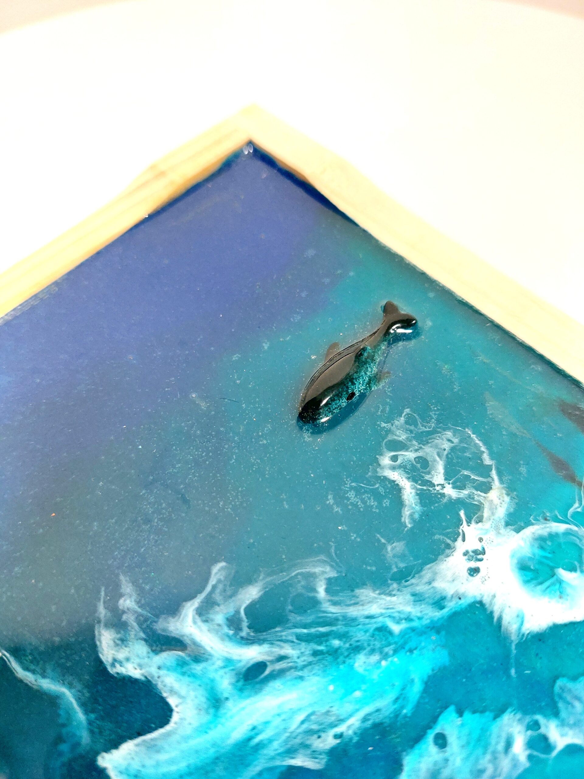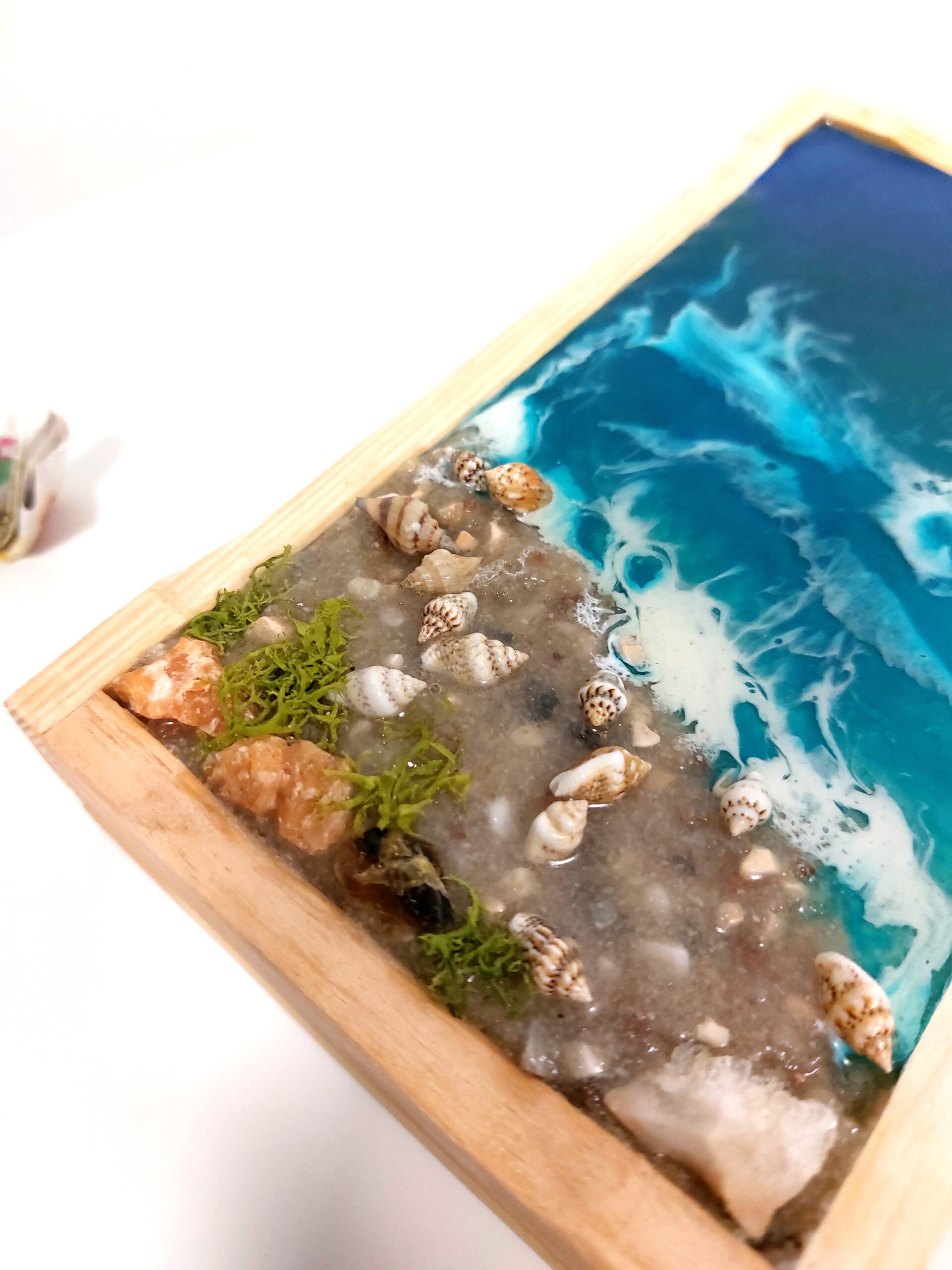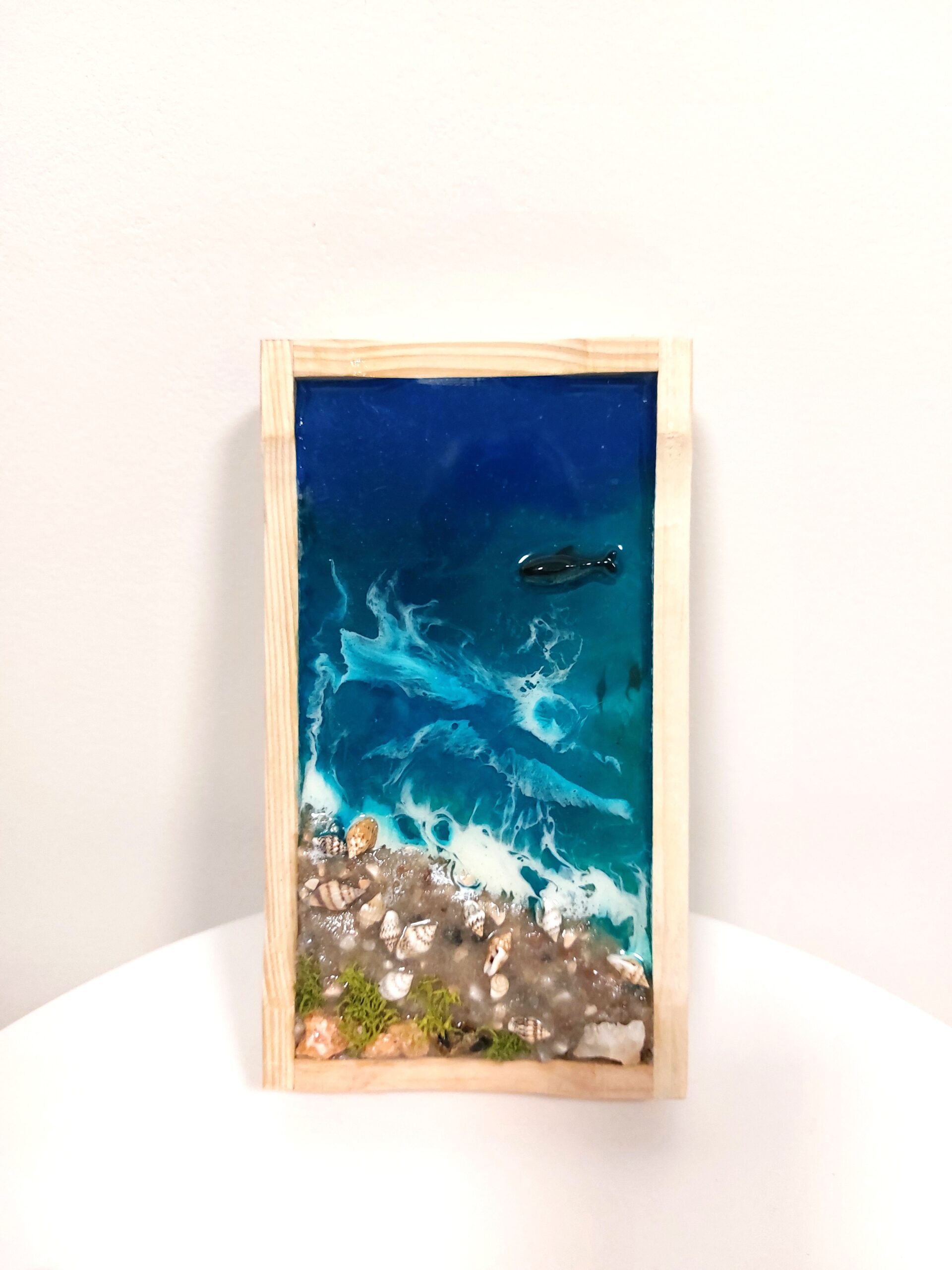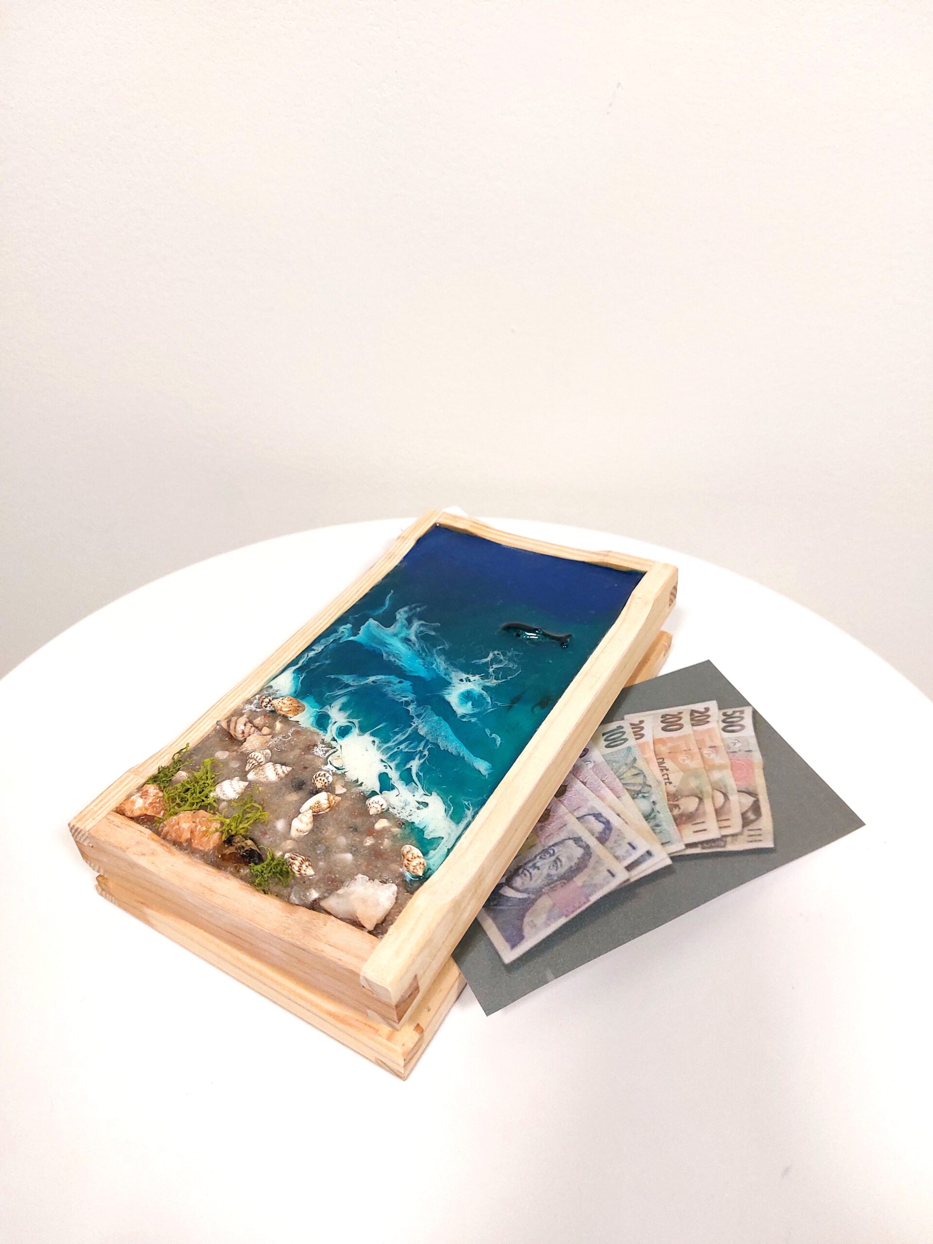 Materiál: epoxidová pryskyřice, ulity, pigmenty, dřevěná krabička